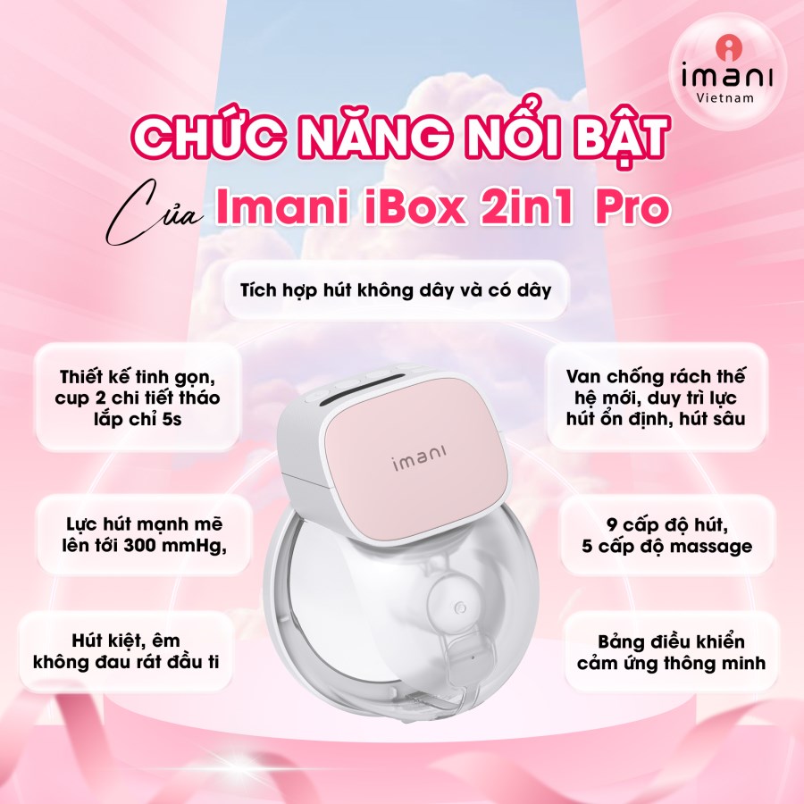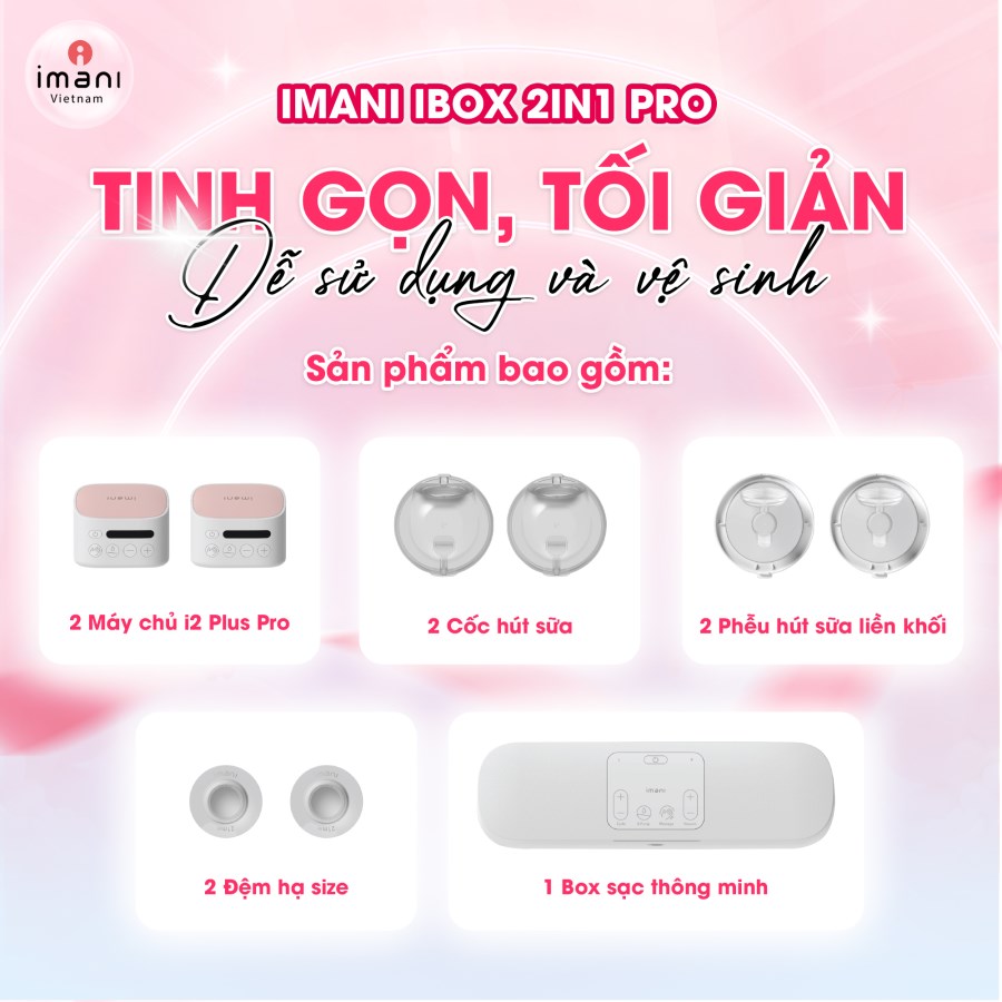 - Ibox 2in1 Pro là phiên bản mới nhất (2025) của dòng máy hút sữa rảnh tay Imani đình đám, kế thừa lực hút hiệu quả của Ibox 2in1, Ibox 2in1 Pro còn tối giản thiết kế cốc hút sữa, giúp mẹ không mất nhiều thời gian vào việc vệ sinh máy.